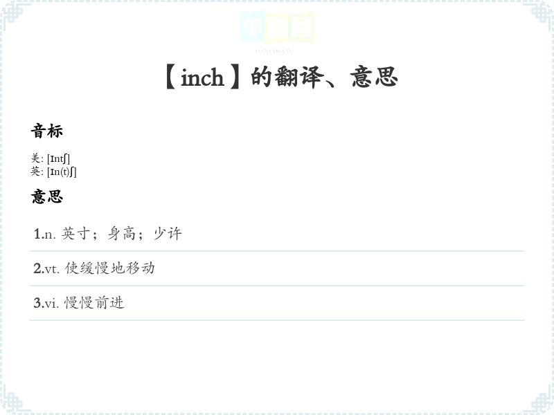 - 联想“inch”与“inch by inch”这个短语,可以想象成“逐步前进”的意思,帮助记忆这个单位的细微和精确。