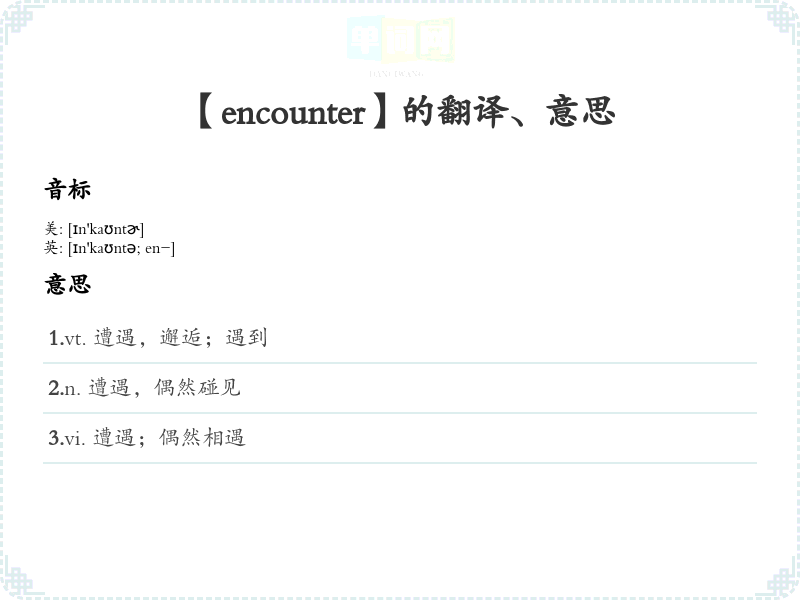 - 字面意思:Encounter的字面含义是“相遇”或“遭遇”。定义为“偶然遇到某人或某事,特别是未预期的情况”。