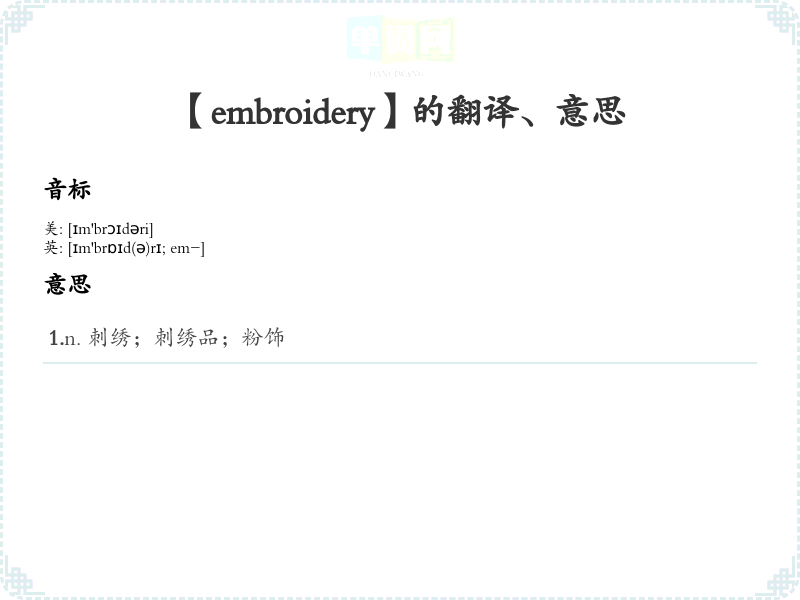 词根记忆法:可以将“embroidery”分解为“em-”和“broid”,理解为“用针和线进行缝制”。通过联想与“broider”相关的词汇(如“刺绣”)来加强记忆。