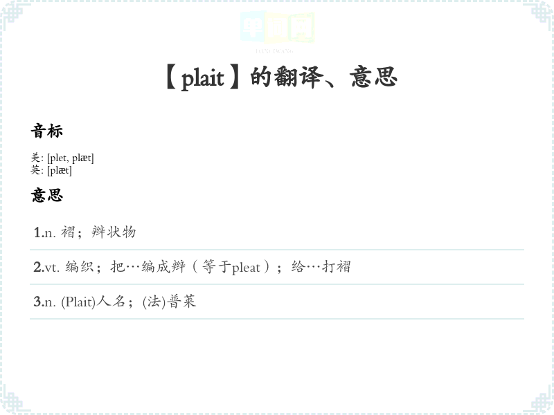 - 谐音联想记忆:将“plait”联想为“play”,想象在玩耍中编织辫子。