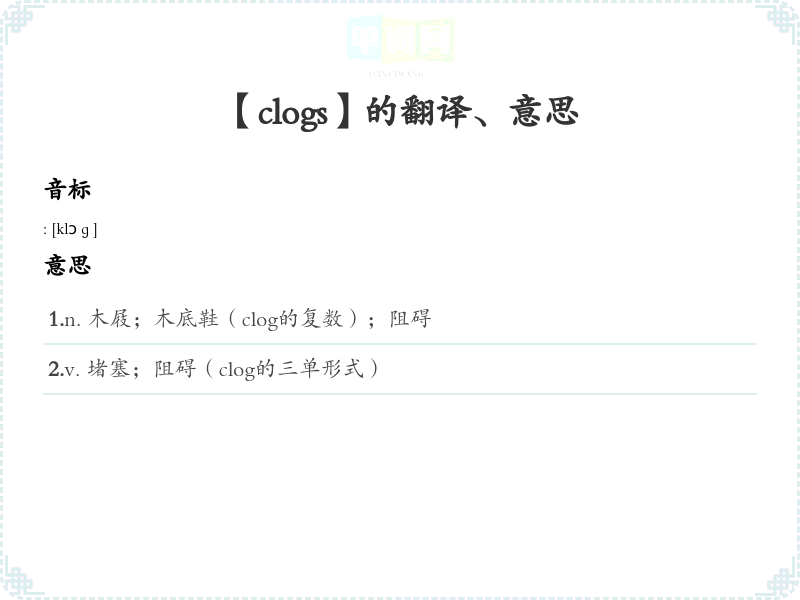 1.n. 木屐;木底鞋(clog的复数);阻碍 2.v. 堵塞;阻碍(clog的三单形式)