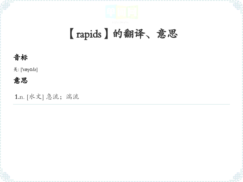 - 字面意思:Rapids 指的是河流中的急流或湍流,通常是由于水流速度较快而形成的水域,具有明显的波动和激流。