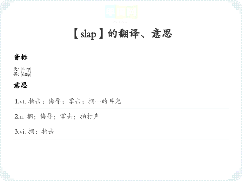 - 通过音标 /slæp/ 来记忆,可以联想“轻拍”的声音,帮助记忆其字义和发音。