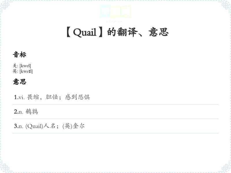 - 字面意思:Quail指的是一种小型的鸟类,通常生活在草地和灌木丛中,具有短而圆的身体和短小的翅膀。作为动词时,quail表示因恐惧而畏缩或退缩。