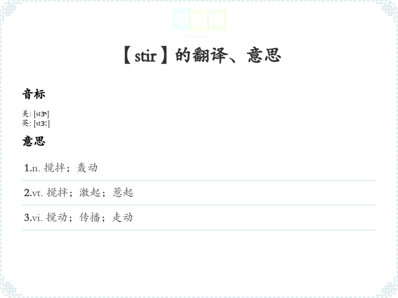 - 词性:动词(verb);名词(noun, 如“a stir”表示骚动或搅动)。