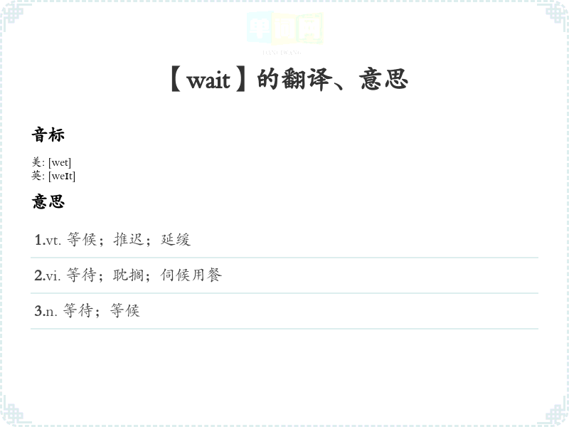 - 谐音联想记忆:可以联想“wait”和“卫”字,如“我在这里等你,像一个卫兵一样守候。”