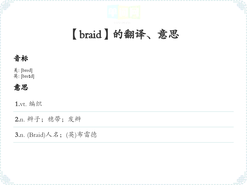 - 谐音联想记忆:可以联想“braid”与“brave”(勇敢),编织代表将不同的线组合在一起,勇敢地面对生活的挑战。