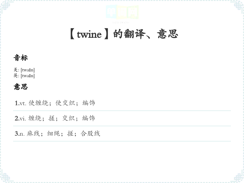 - 音标记忆法:twine的发音为 /twaɪn/。可以通过将其与“twist”(扭转)相联系,帮助记忆这个词的含义。