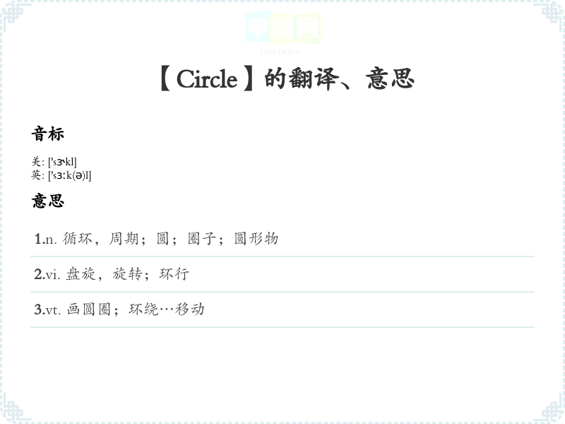 • 音标记忆法:Circle的发音为/ˈsɜːr.kəl/。可以通过听音频并跟读,加深对发音的记忆。