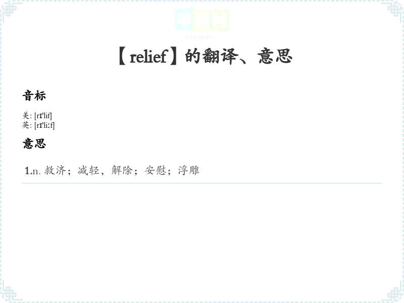 - 谐音联想记忆:可以将“relief”联想成“让痛苦离开”,帮助记忆其释义。