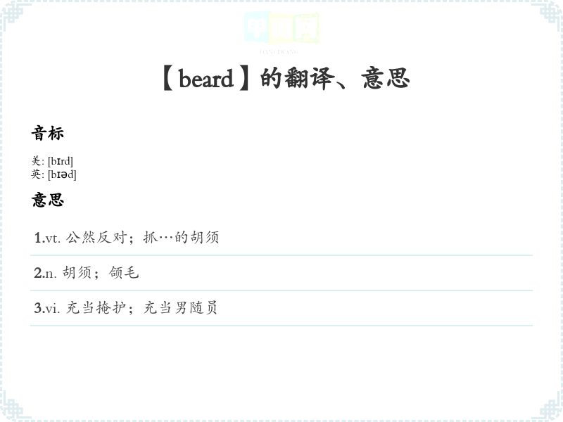 3.vi. 充当掩护;充当男随员 4.n. (Beard)人名;(英)比尔德