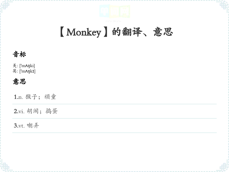 - Monkey 的音标是 /ˈmʌŋ.ki/,可以通过发音练*加强记忆。