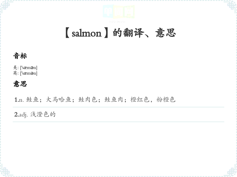 以上就是对单词 “salmon” 的详细学*与分析,希望能帮助你更好地理解和使用这个词汇!