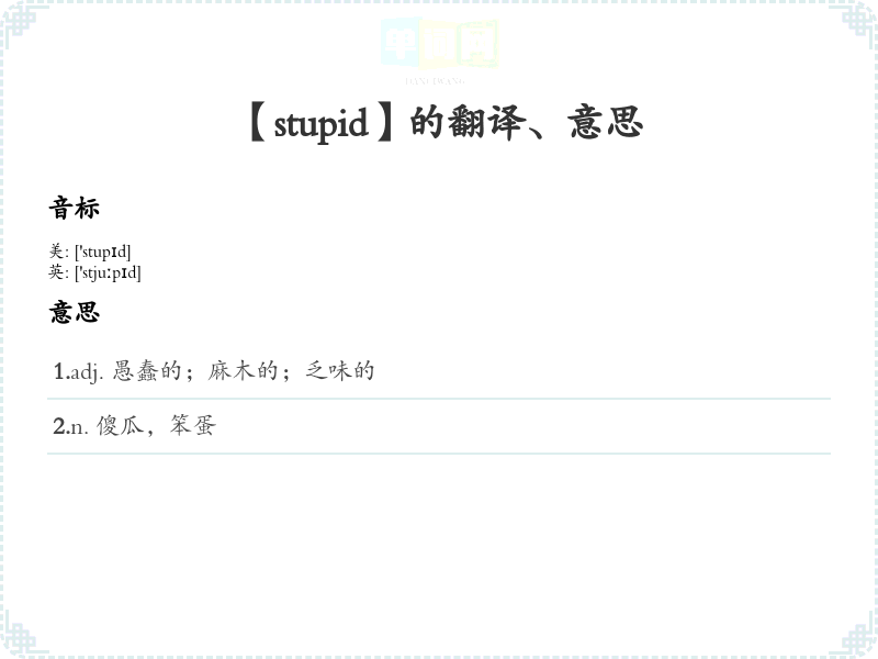 - 谐音联想记忆:可以将“stupid”联想为“死呆”,即“死”代表愚蠢,“呆”代表无知。