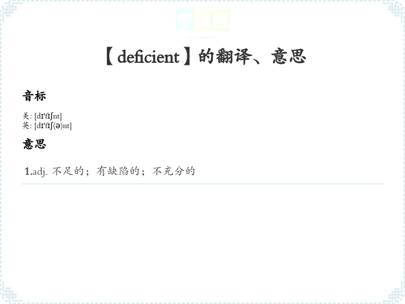 词源分析:该单词源自拉丁语“deficientem”,是动词“deficere”的现在分词形式,意为“缺乏”或“离开”。“de-”表示“下”或“离开”,而“facere”则是“做”的意思。