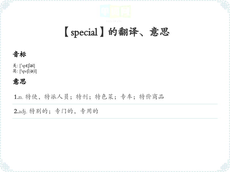 "Special"的字面含义是“特别的”或“独特的”。它通常用来描述某物或某人具有不同于一般的特征或重要性。 - 词性: