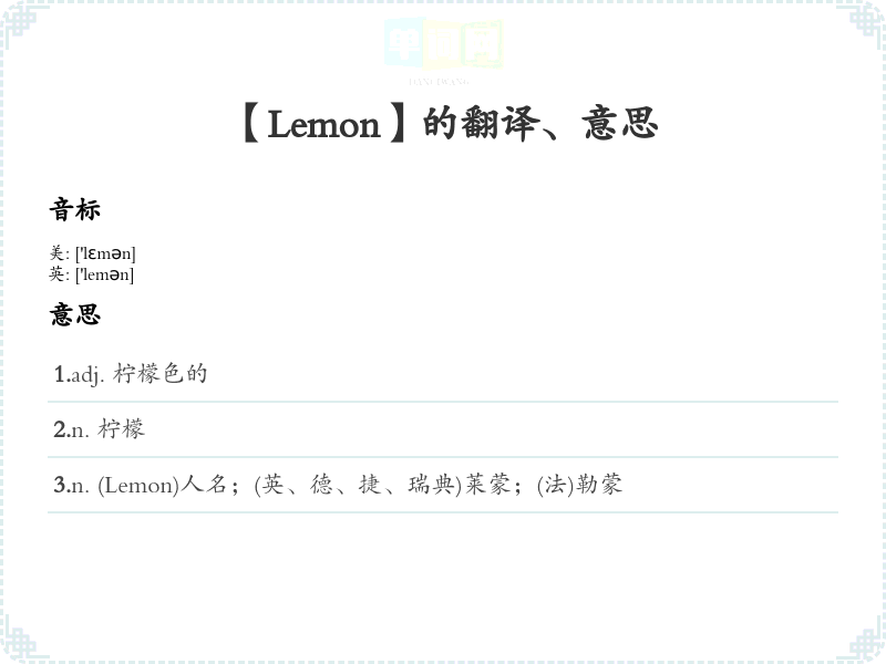 - 字面意思:Lemon 是一种常见的柑橘类水果,通常呈黄色,味道酸涩。它的定义是“圆形的黄色柑橘果实,具有酸味,常用于饮料和烹饪中”。