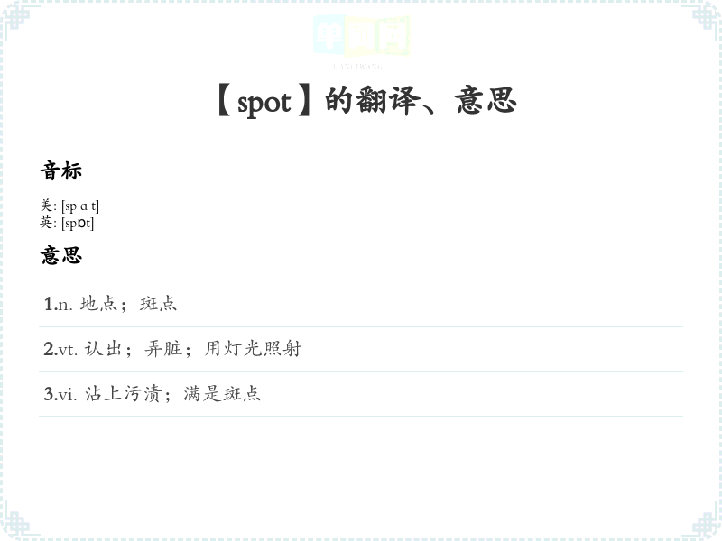 - 谐音联想记忆:将“spot”与中文的“点”联系起来,可以想象在纸上用笔留下一个“点”。