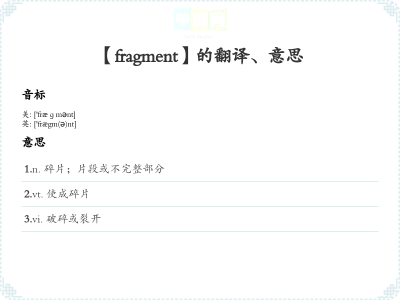 fragment的字面含义是“碎片”或“片段”。它指的是某个整体的一部分,通常是未完成或缺失的部分。 - 词性:名词、动词。