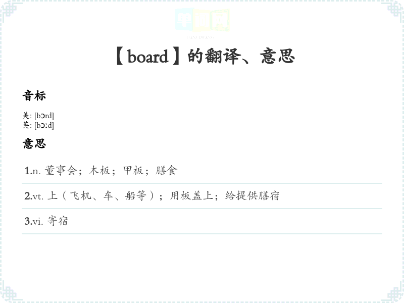 通过以上分析,可以更全面地理解和掌握“board”这个单词的含义、用法和相关联的词汇。