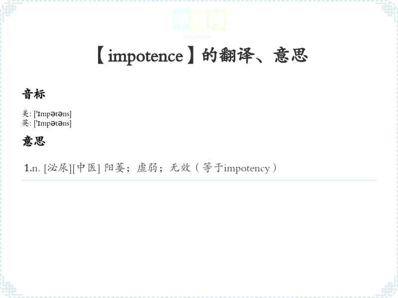 - 定义:Impotence是指个体在身体或情感上无法进行正常的活动,尤其常用于描述男性的勃起功能障碍。