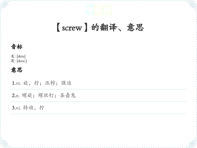 - 定义:Screw 指一种带有螺纹的金属棒,通常用于连接物体或固定物件。可以是一个名词,也可以作为动词使用。