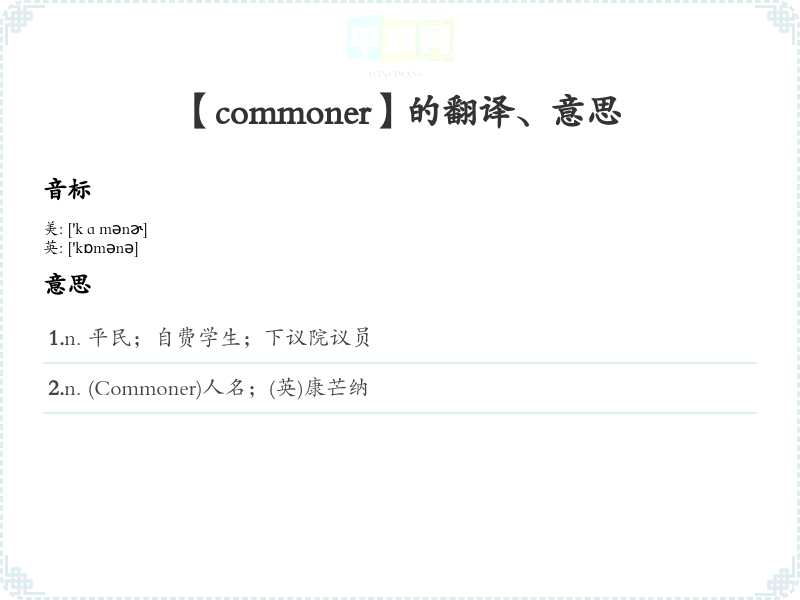 1.n. 平民;自费学生;下议院议员 2.n. (Commoner)人名;(英)康芒纳