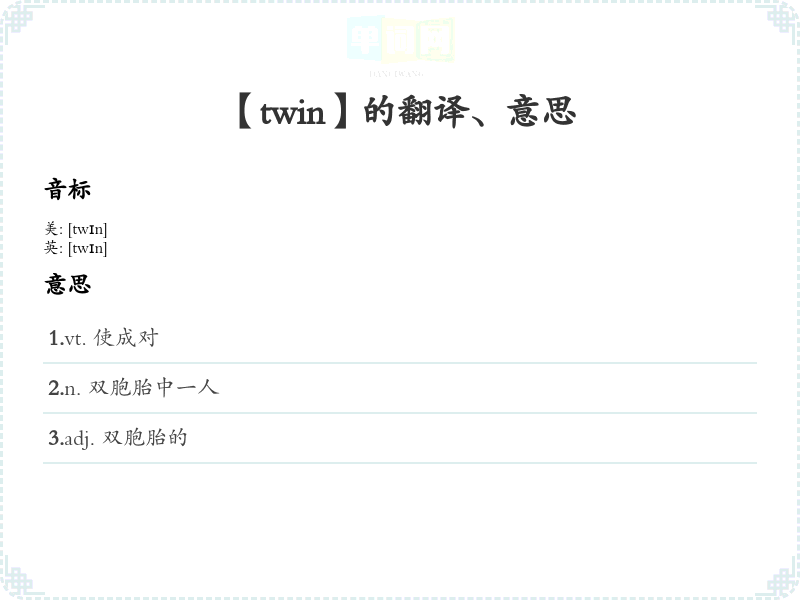 - 将“twin”读作 /twɪn/,可以联系“tw”发音与“two”相结合,帮助记忆双胞胎是两个的概念。