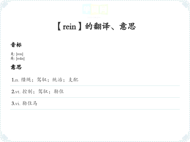 - "Rein" 源自拉丁语 "retinere",意为“保持”或“控制”。词根 "re-" 表示“回”,而 "tenere" 意为“抓住”或“保持”。
