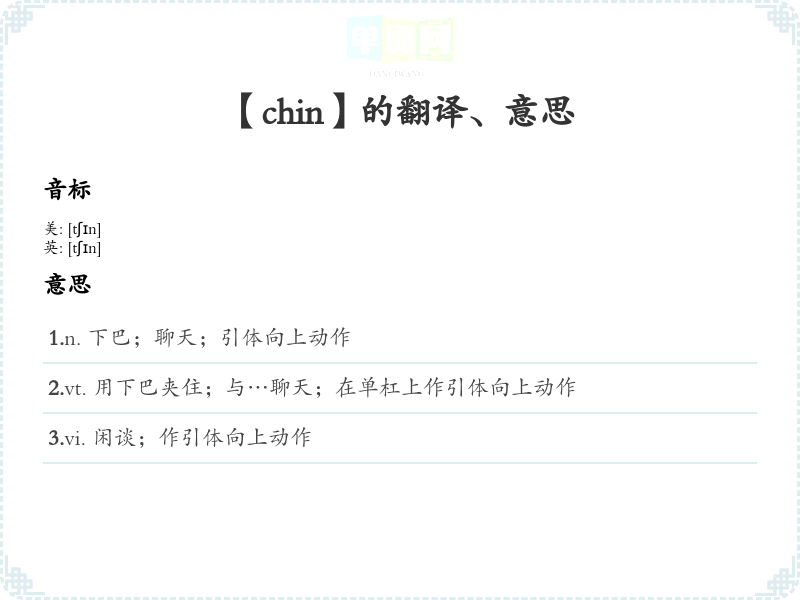 2.vt. 用下巴夹住;与…聊天;在单杠上作引体向上动作