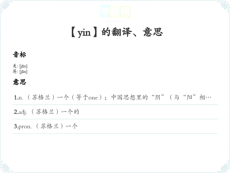 1.n. (苏格兰)一个(等于one);中国思想里的“阴”(与“阳”相对);中国的殷代