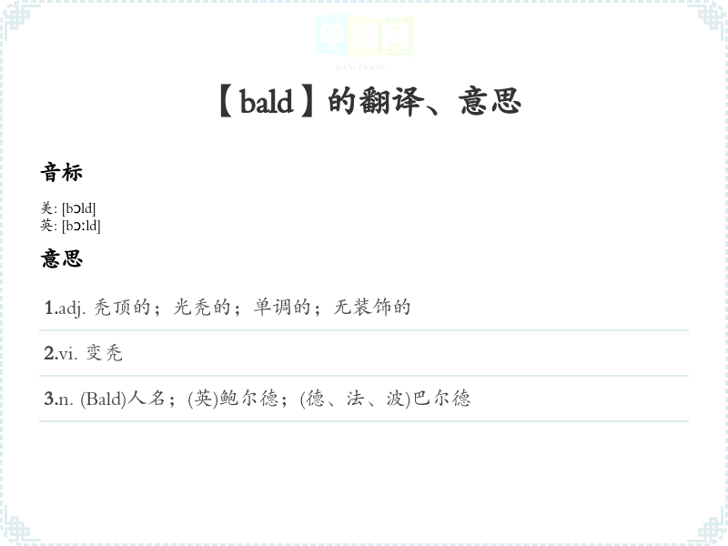 以上是关于单词 "bald" 的全面分析,希望对学*和理解该词有所帮助!