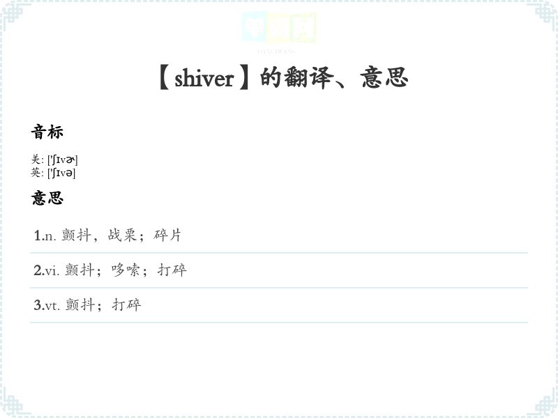 - /ˈʃɪvər/,可以分解为“shi”和“ver”来帮助记忆。
