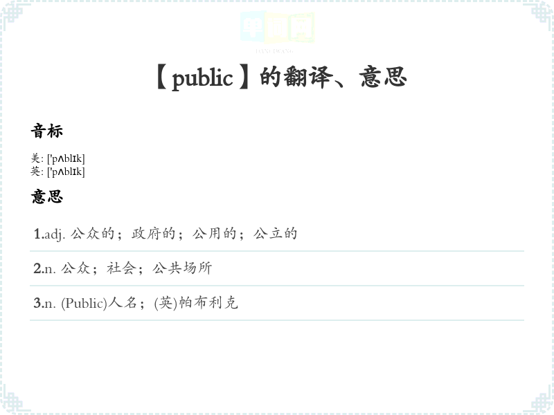 - 音标记忆法:/ˈpʌblɪk/。可以通过发音练*来加深印象,想象字母“p”像是一个开放的空间,表示“公众”。
