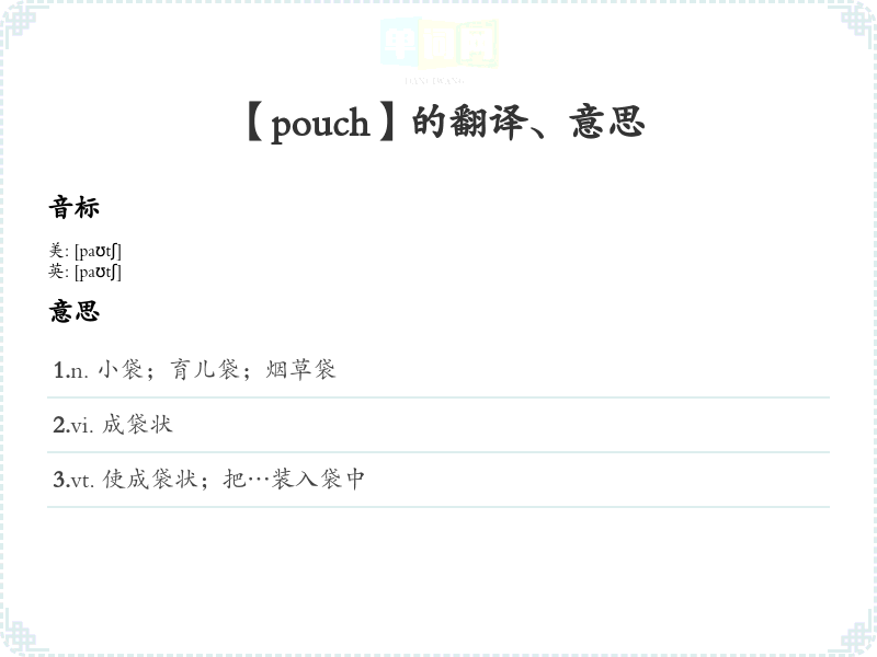 - 谐音联想记忆:pouch发音类似于“泡”,可以想象泡泡里装着小玩意儿。