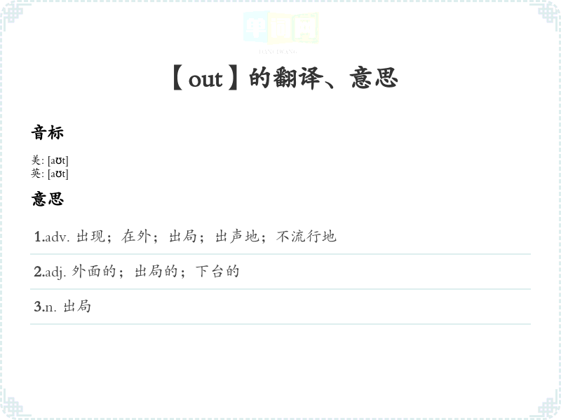 - 谐音联想记忆:可以联想“out”与“奥特曼”(外来的英雄)联系起来,帮助记忆其“外”的含义。