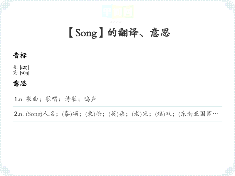 - 音标记忆法:Song的音标为/sɔːŋ/,可以通过重复发音来加深记忆。