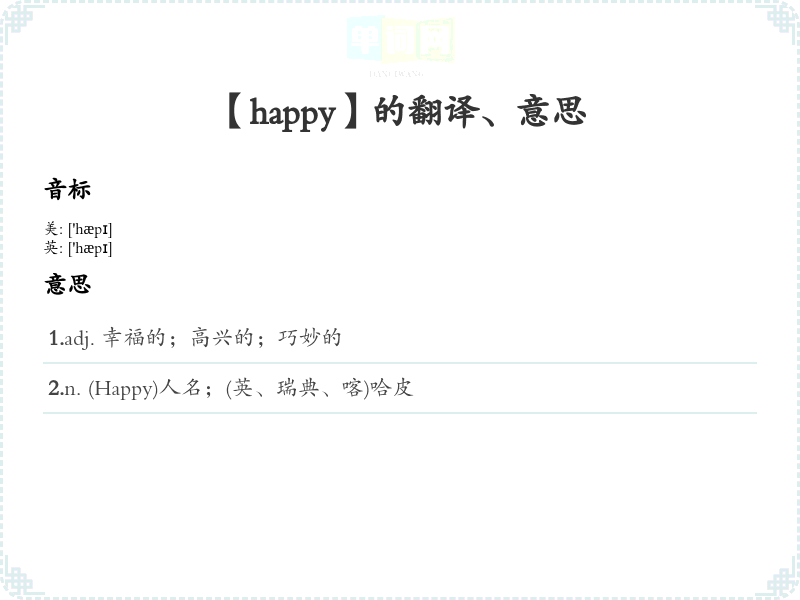 1.adj. 幸福的;高兴的;巧妙的 2.n. (Happy)人名;(英、瑞典、喀)哈皮