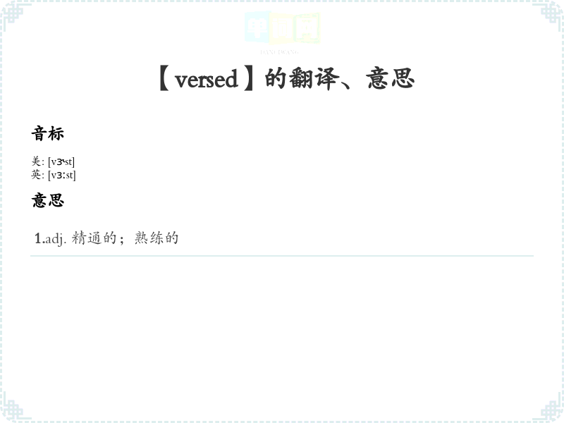 音标记忆法:可以使用“/vɜrst/”的发音来记忆“versed”。将这个音节与“versed”相关的图像或情景结合,比如一个人正在阅读书籍,表示他对某个领域的知识非常熟悉。