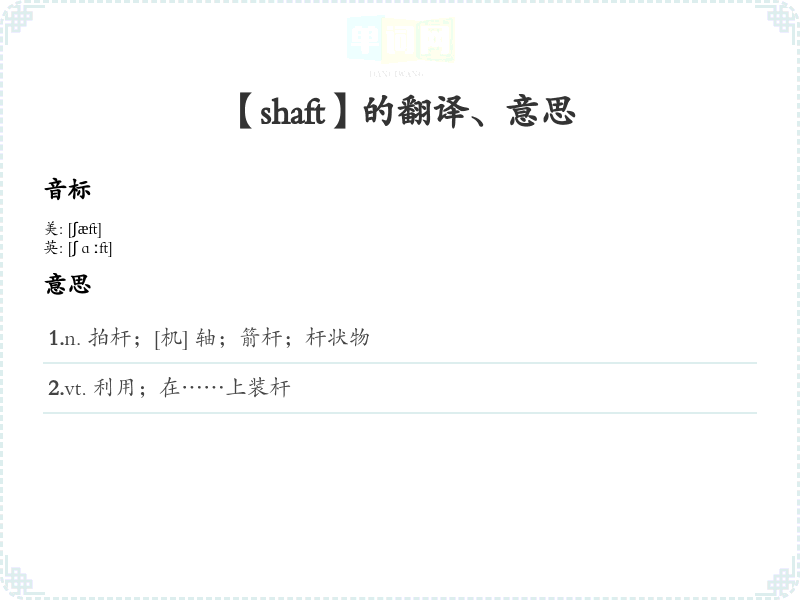 - 音标记忆法:/ʃæft/,可以通过发音与“shaft”相似的词来帮助记忆,比如“craft”(工艺)。