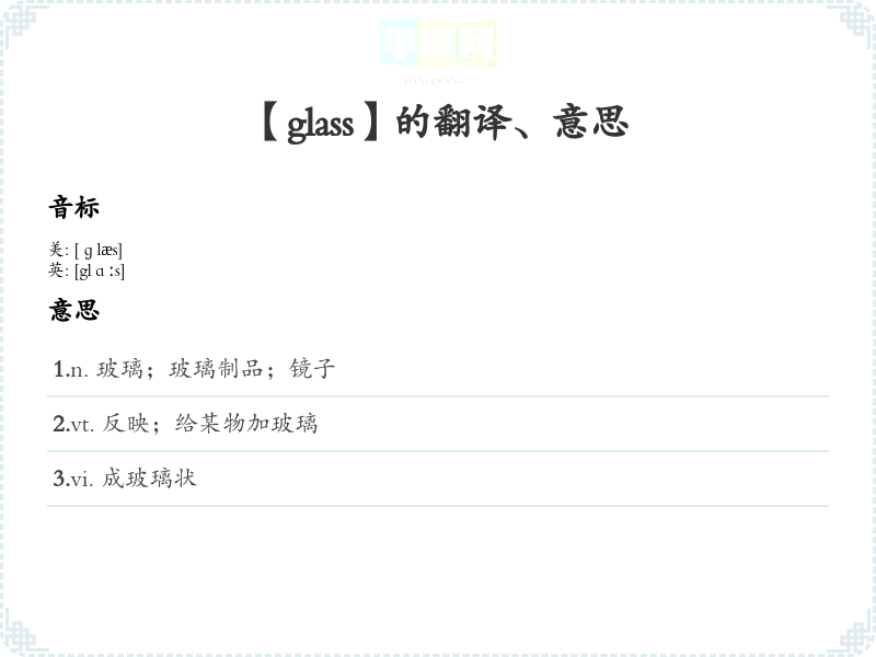 glass指的是一种透明的固体材料,通常用于制作窗户、杯子、瓶子等物品。它的定义为“一种通过熔融石英或其他材料制成的透明或半透明的硬物质”。 - 词性:名词和动词(作为名词时使用更为普遍)。