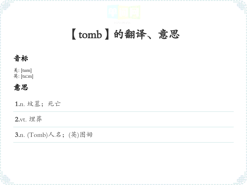 - 字面意思:tomb 是指一个用来埋葬尸体的地方,通常是一个结构化的建筑或洞穴。