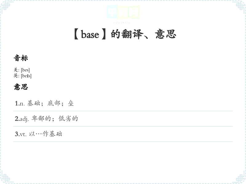 - 理解“base”在不同上下文中的用法,帮助联想和记忆。