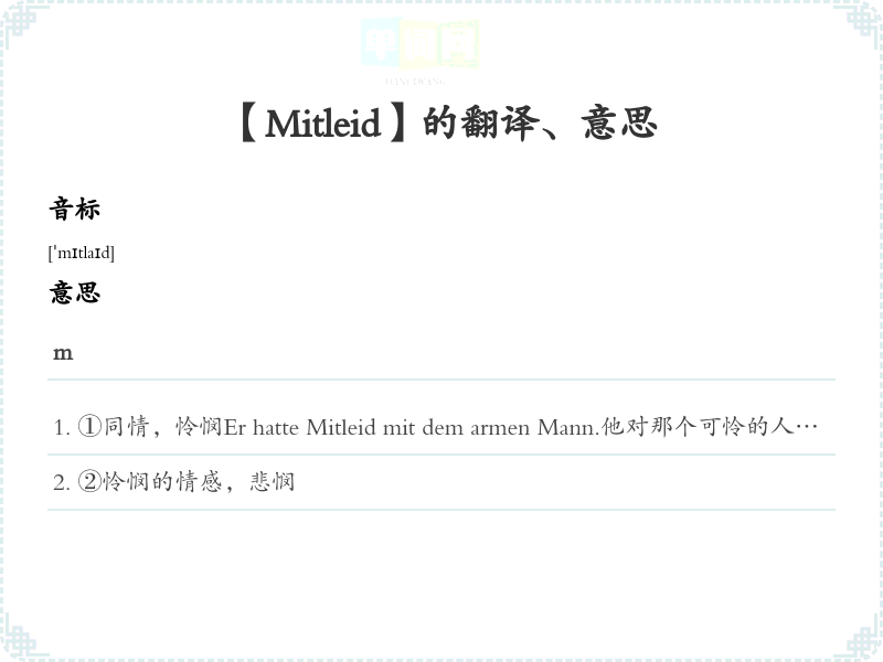 ①同情,怜悯Er hatte Mitleid mit dem armen Mann.他对那个可怜的人感到同情。