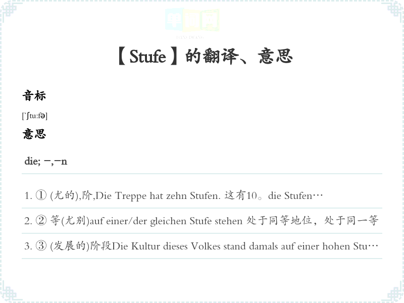 ① (尤的),阶,Die Treppe hat zehn Stufen. 这有10。die Stufen hinuntergehen/hinaufgehen/hinaufsteigen 走下/走上/登上