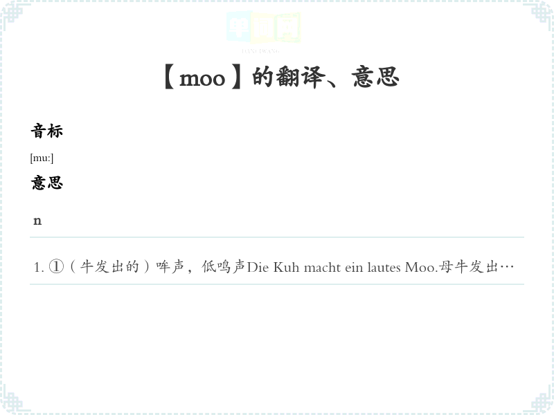 ①(牛发出的)哞声,低鸣声Die Kuh macht ein lautes Moo.母牛发出很大的哞声。