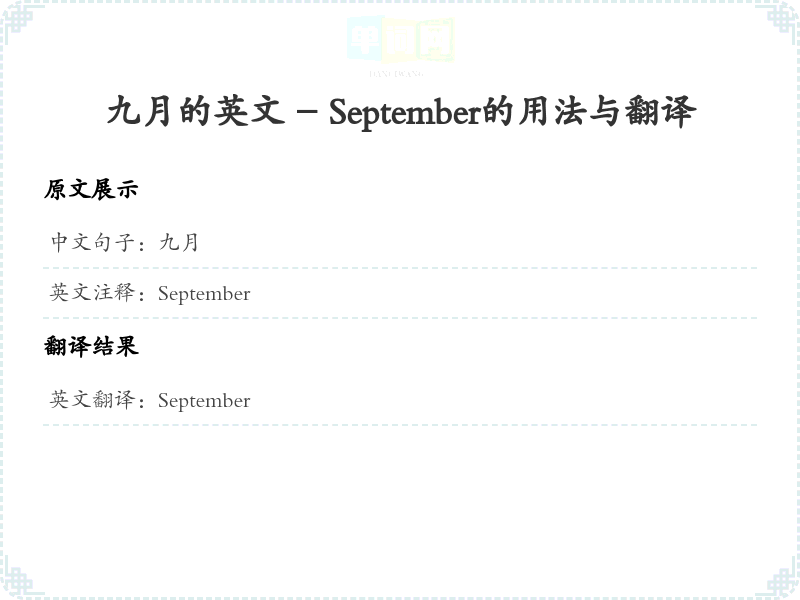 - 在翻译‘九月’时,直接使用了其对应的英文单词‘September’。这个词是一个专有名词,属于月份的名称,翻译时保持了原意和准确性。