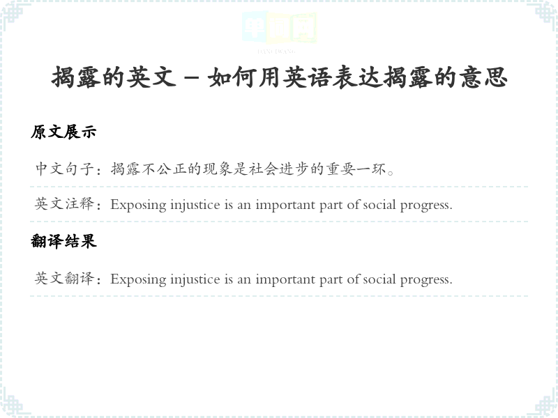通过本篇文章的学习,希望你能够对"揭露不公正的现象是社会进步的重要一环。"这个词的翻译及相关用法有一个全面的理解,并在实际应用中灵活运用。