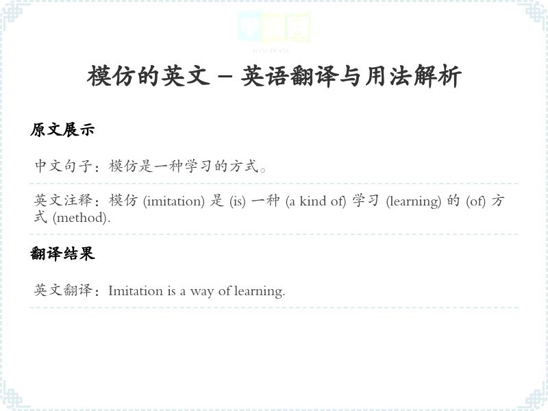 通过本篇文章的学习,希望你能够对"模仿是一种学习的方式。"这个词的翻译及相关用法有一个全面的理解,并在实际应用中灵活运用。