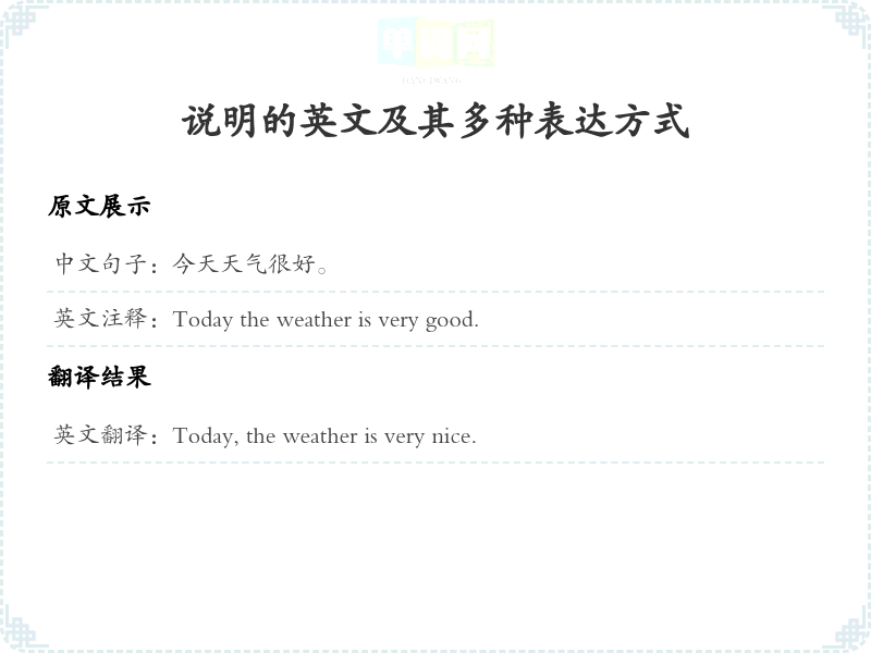 - 在翻译时,需要考虑中文句子的结构及其含义。'今天天气很好'可以直接翻译为'Today the weather is very nice',其中'今天天气'对应'Today, the weather',而'很好'则可以用'very nice'来表达。